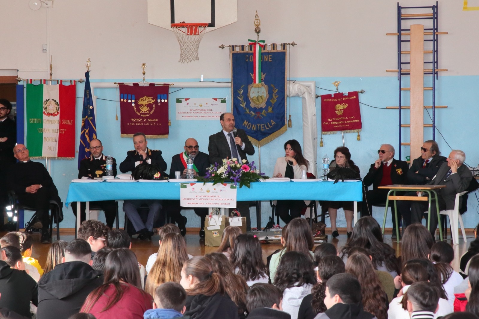 Montella, 10 febbraio 2025 – Una giornata ricca di emozioni ha segnato la commemorazione dell’80° anniversario del sacrificio di Giovanni Palatucci, eroe della giustizia e martire della libertà, morto nel campo di concentramento di Dachau. L'evento, patrocinato dal Comune di Montella e dalla Provincia di Avellino, è stato organizzato con impegno dall’Istituto Comprensivo “Giovanni Palatucci”, che porta con orgoglio il nome di questo straordinario esempio di coraggio e altruismo, grazie anche alla collaborazione del Circolo Culturale Cristiano Santa Croce e all’Associazione Nazionale Bersaglieri, sezione di Montella. La celebrazione, coincisa con il Giorno del Ricordo, ha richiamato anche la memoria delle vittime delle foibe. La mattinata si è aperta con la deposizione di una composizione floreale in piazza Giovanni Palatucci, seguita dalla commemorazione ufficiale nella palestra dell’Istituto.
